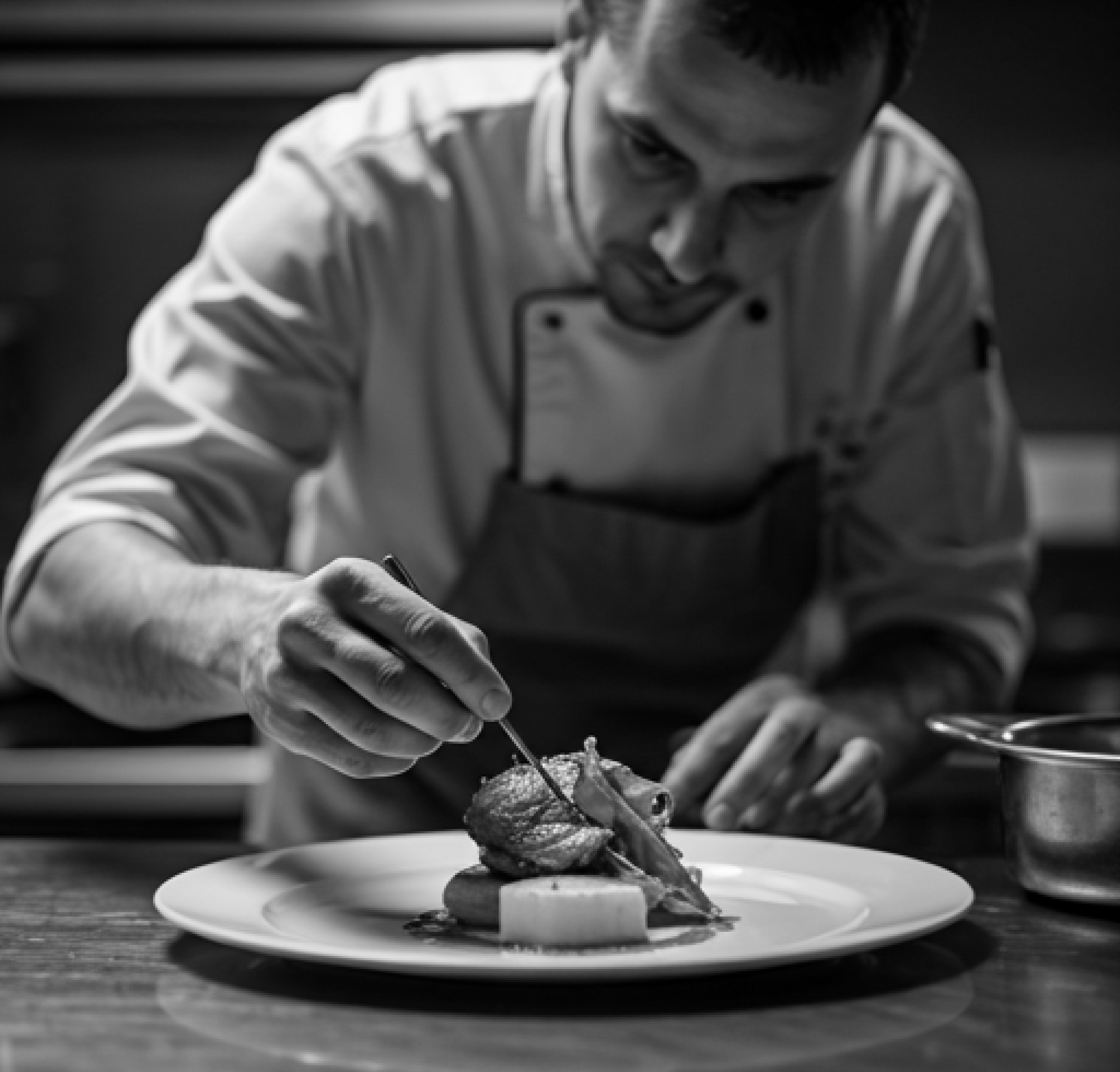 Milk-fed lamb saddle, fermented black garlic, roasted parsnip silk, and jus of burnt hay.